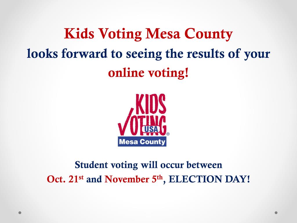 Kids Voting Mesa County looks forward to seeing the results of your online voting! Student votingwill occur between Oct. 21stand November 5th, ELECTION DAY!