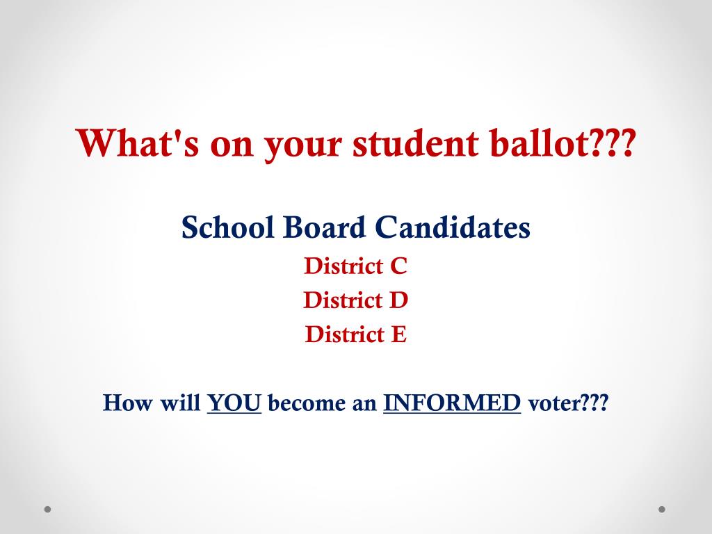 What's on your student ballot??? School Board Candidates District C District D District E How will YOU become an INFORMED voter???