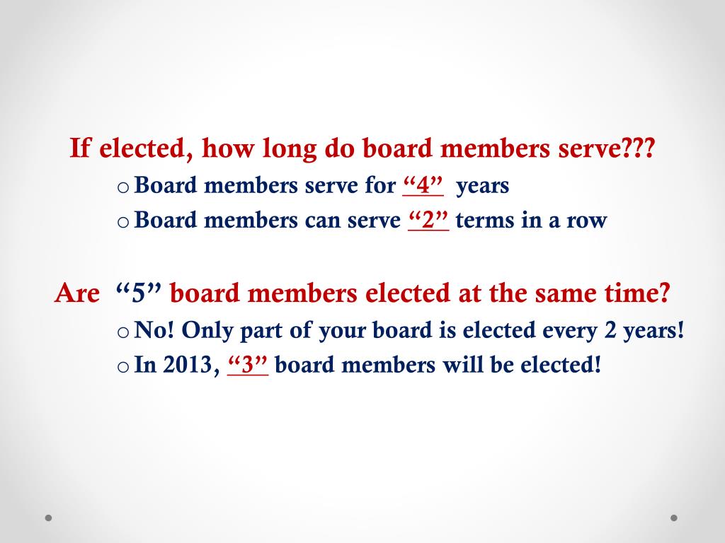 If elected, how long do board members serve??? • Board members serve for “4”years • Board members can serve “2”terms in a row Are “5” board members elected at the same time? • No! Only part of your board is elected every 2 years! • In 2013, “3”board members will be elected!