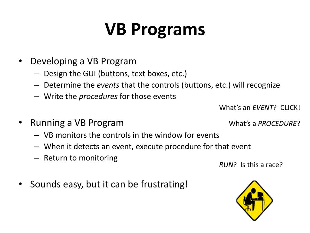 VB Programs • Developing a VB Program • Design the GUI (buttons, text boxes, etc.) • Determine the events that the controls (buttons, etc.) will recognize • Write the procedures for those events • Running a VB Program • VB monitors the controls in the window for events • When it detects an event, execute procedure for that event • Return to monitoring • Sounds easy, but it can be frustrating! What’s an EVENT? CLICK! What’s a PROCEDURE? RUN? Is this a race?