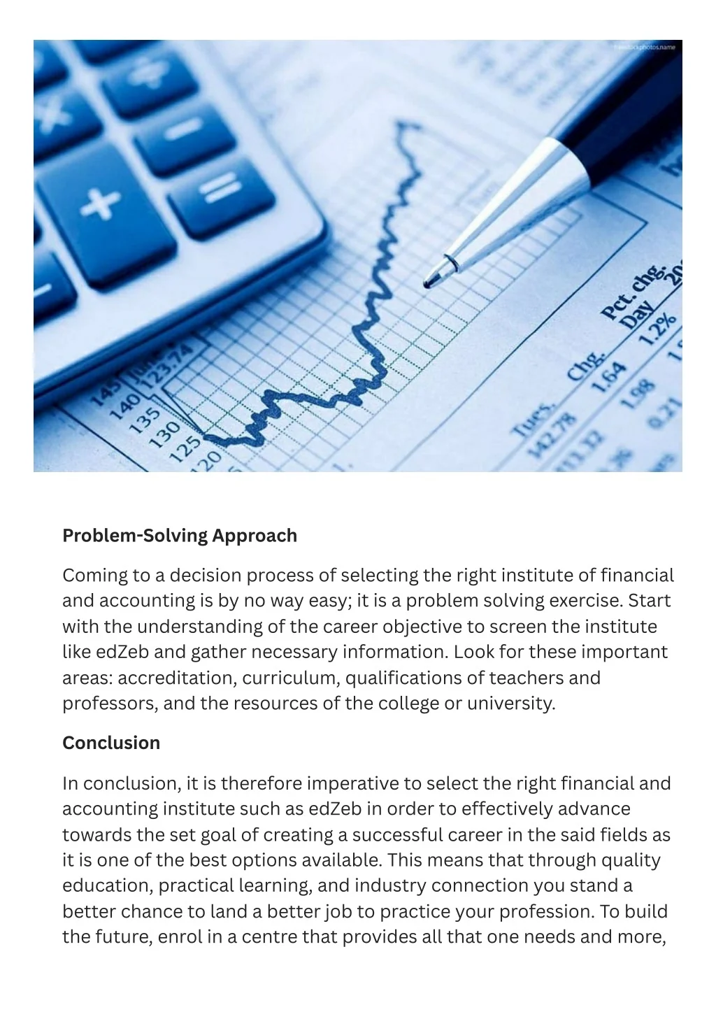 Problem-Solving Approach Coming to a decision process of selecting the right institute of financial and accounting is by no way easy; it is a problem solving exercise. Start with the understanding of the career objective to screen the institute like edZeb and gather necessary information. Look for these important areas: accreditation, curriculum, qualifications of teachers and professors, and the resources of the college or university. Conclusion In conclusion, it is therefore imperative to select the right financial and accounting institute such as edZeb in order to effectively advance towards the set goal of creating a successful career in the said fields as it is one of the best options available. This means that through quality education, practical learning, and industry connection you stand a better chance to land a better job to practice your profession. To build the future, enrol in a centre that provides all that one needs and more,