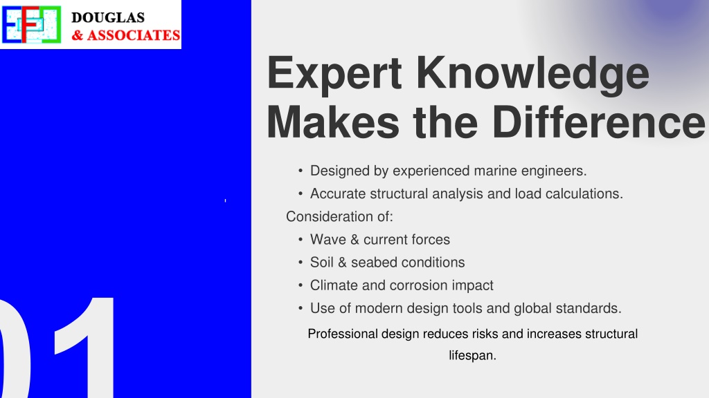 Expert Knowledge Makes the Difference • Designed by experienced marine engineers. • Accurate structural analysis and load calculations. Consideration of: • Wave & current forces • Soil & seabed conditions • Climate and corrosion impact • Use of modern design tools and global standards. - 01 Professional design reduces risks and increases structural lifespan.