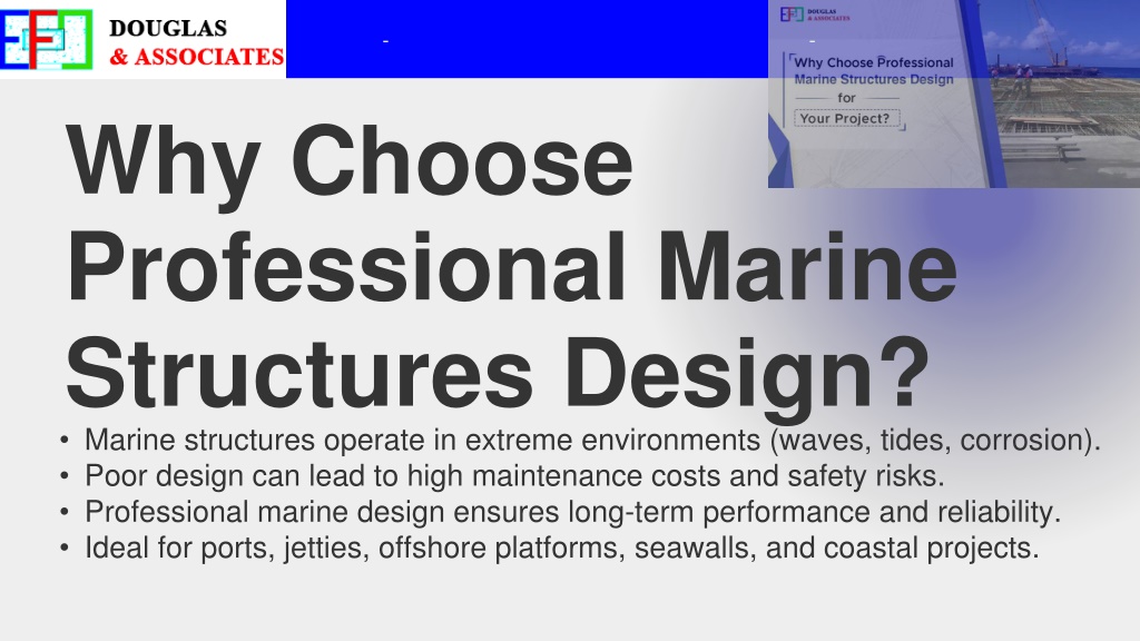 Building a structure near the sea looks beautiful, but it brings many challenges, like:<br><br>Waves hit hard<br>Salt weakens materials<br>Tides shift the ground below<br>That is why choosing a marine structures design service from the start is necessary. Professional planning protects your project and your investment. Coastal structures need more than basic design skills. They need experience with marine conditions. Hence, a skilled marine structure consultant in the Caribbean understands how the ocean behaves. <br>visit us: https://www.efdouglasandassociates.com/why-choose-professional-marine-structures-desig