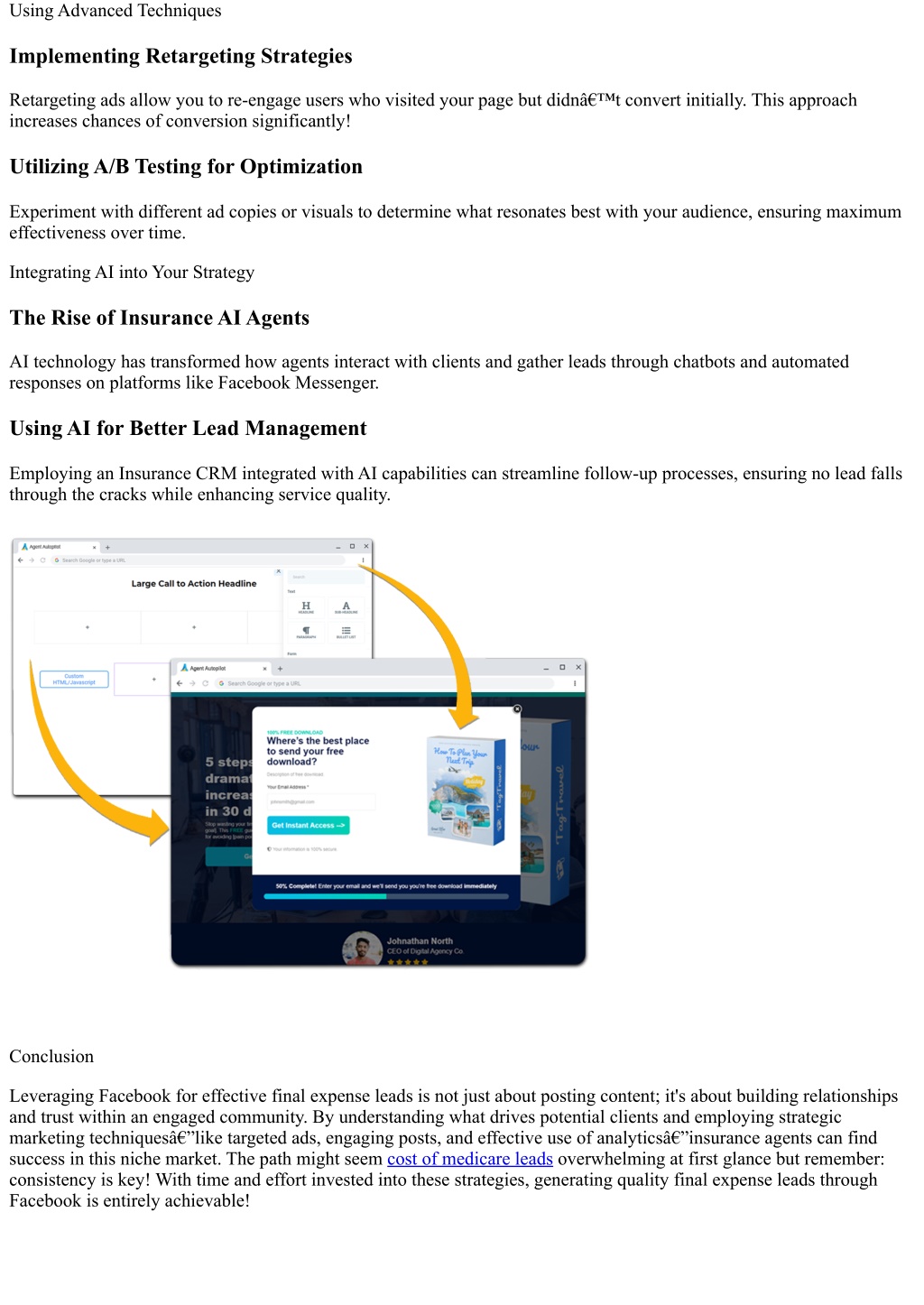 Using Advanced Techniques Implementing Retargeting Strategies Retargeting ads allow you to re-engage users who visited your page but didn’t convert initially. This approach increases chances of conversion significantly! Utilizing A/B Testing for Optimization Experiment with different ad copies or visuals to determine what resonates best with your audience, ensuring maximum effectiveness over time. Integrating AI into Your Strategy The Rise of Insurance AI Agents AI technology has transformed how agents interact with clients and gather leads through chatbots and automated responses on platforms like Facebook Messenger. Using AI for Better Lead Management Employing an Insurance CRM integrated with AI capabilities can streamline follow-up processes, ensuring no lead falls through the cracks while enhancing service quality. Conclusion Leveraging Facebook for effective final expense leads is not just about posting content; it's about building relationships and trust within an engaged community. By understanding what drives potential clients and employing strategic marketing techniques—like targeted ads, engaging posts, and effective use of analytics—insurance agents can find success in this niche market. The path might seem cost of medicare leads overwhelming at first glance but remember: consistency is key! With time and effort invested into these strategies, generating quality final expense leads through Facebook is entirely achievable!
