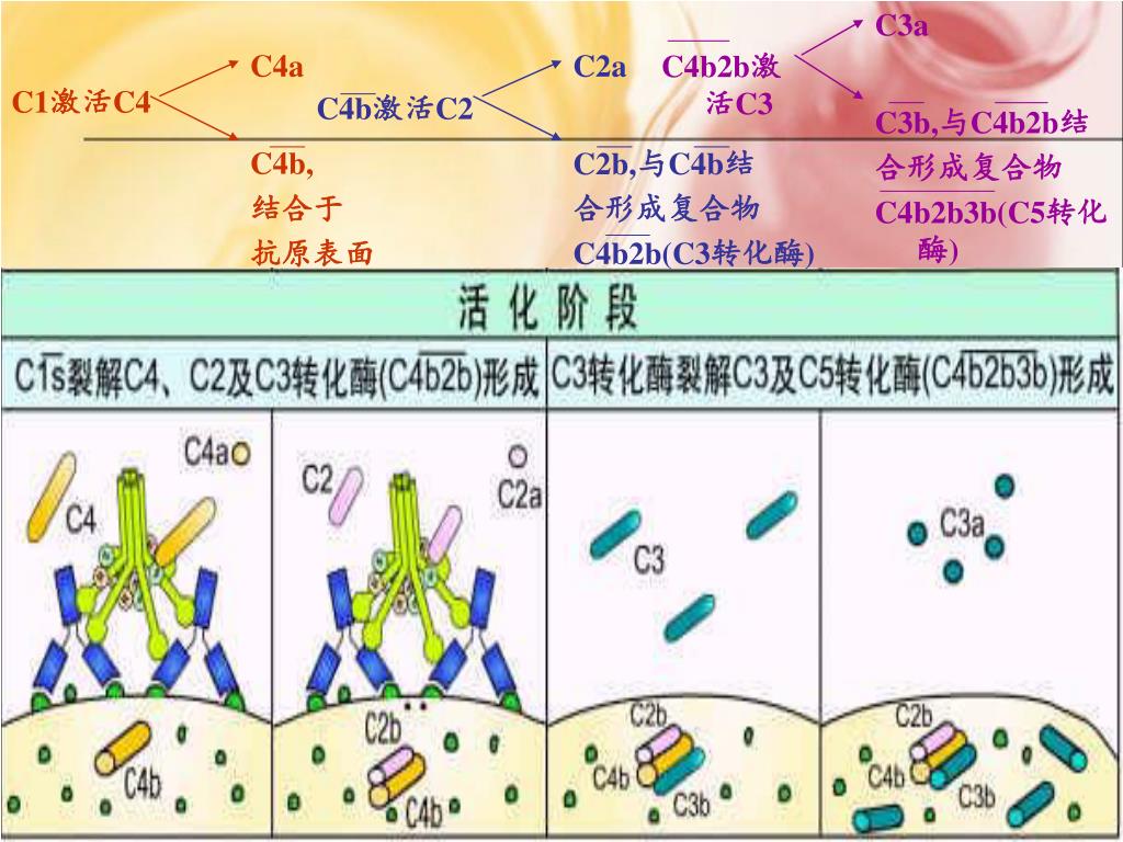 C4b2b激活C3 C4a C2a C3a C4b激活C2 C1激活C4 C4b, 结合于 抗原表面 C2b,与C4b结 合形成复合物 C4b2b(C3转化酶) C3b,与C4b2b结 合形成复合物 C4b2b3b(C5转化酶)