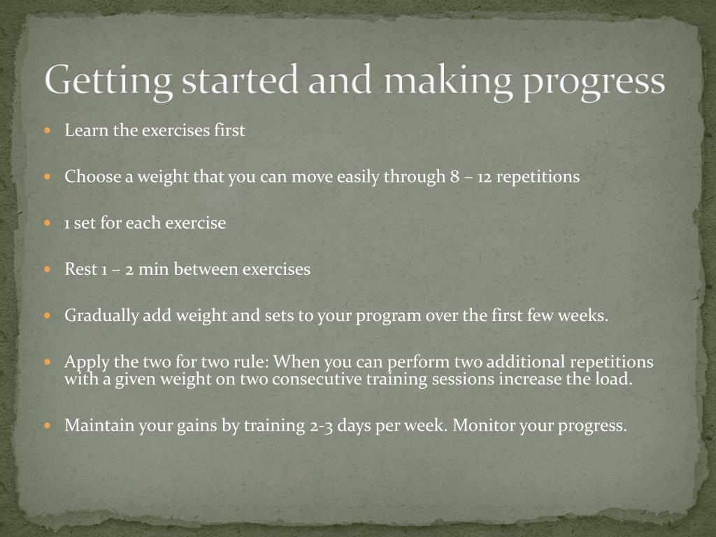 Getting started and making progress • Learn the exercises first • Choose a weight that you can move easily through 8 – 12 repetitions • 1 set for each exercise • Rest 1 – 2 min between exercises • Gradually add weight and sets to your program over the first few weeks. • Apply the two for two rule: When you can perform two additional repetitions with a given weight on two consecutive training sessions increase the load. • Maintain your gains by training 2-3 days per week. Monitor your progress.