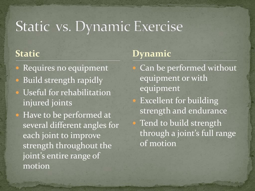 Static vs. Dynamic Exercise Static Dynamic • Requires no equipment • Build strength rapidly • Useful for rehabilitation injured joints • Have to be performed at several different angles for each joint to improve strength throughout the joint’s entire range of motion • Can be performed without equipment or with equipment • Excellent for building strength and endurance • Tend to build strength through a joint’s full range of motion