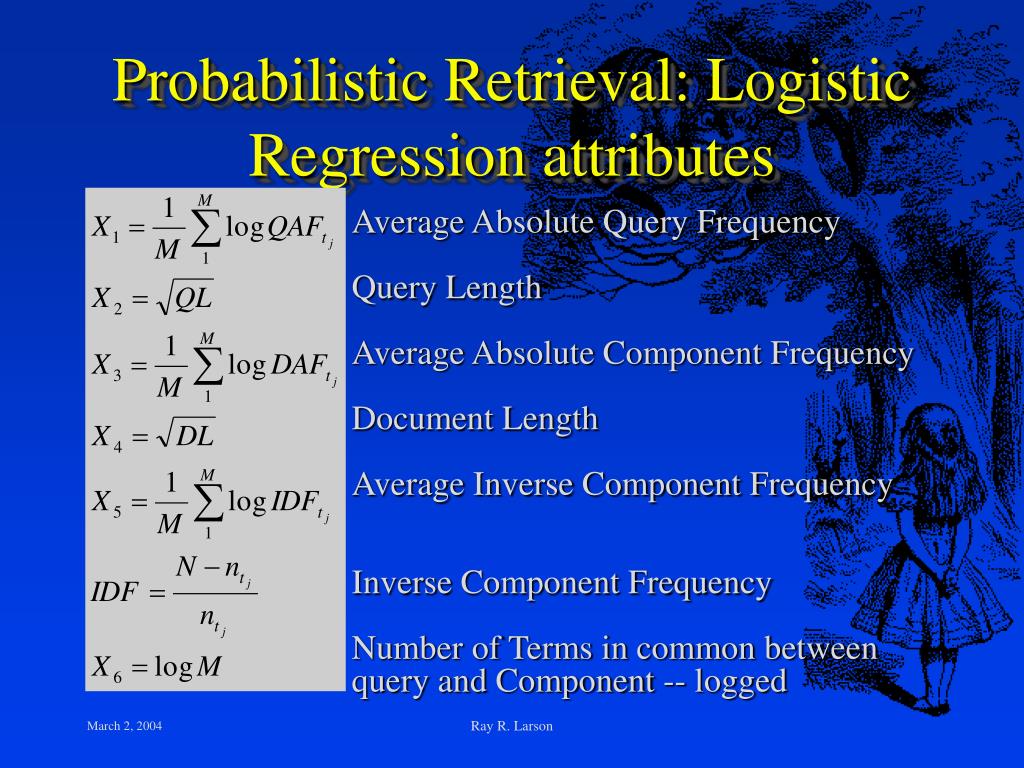 Probabilistic Retrieval: Logistic Regression attributes Average Absolute Query Frequency Query Length Average Absolute Component Frequency Document Length Average Inverse Component Frequency Inverse Component Frequency Number of Terms in common between query and Component -- logged Ray R. Larson