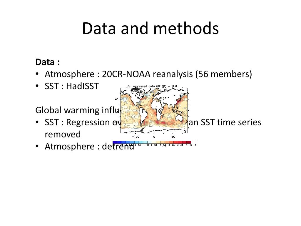 Data and methods • Data : • Atmosphere : 20CR-NOAA reanalysis (56 members) • SST : HadISST • Global warming influence removed : • SST : Regression over the global mean SST time series removed • Atmosphere : detrend