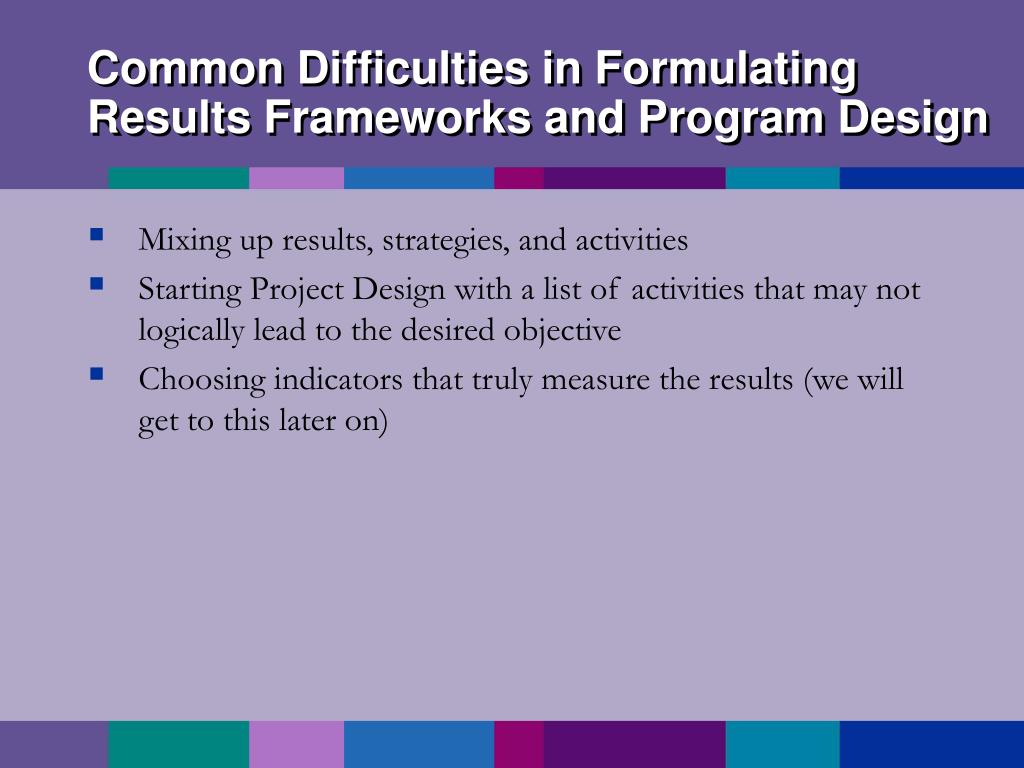 Common Difficulties in Formulating Results Frameworks and Program Design • Mixing up results, strategies, and activities • Starting Project Design with a list of activities that may not logically lead to the desired objective • Choosing indicators that truly measure the results (we will get to this later on)
