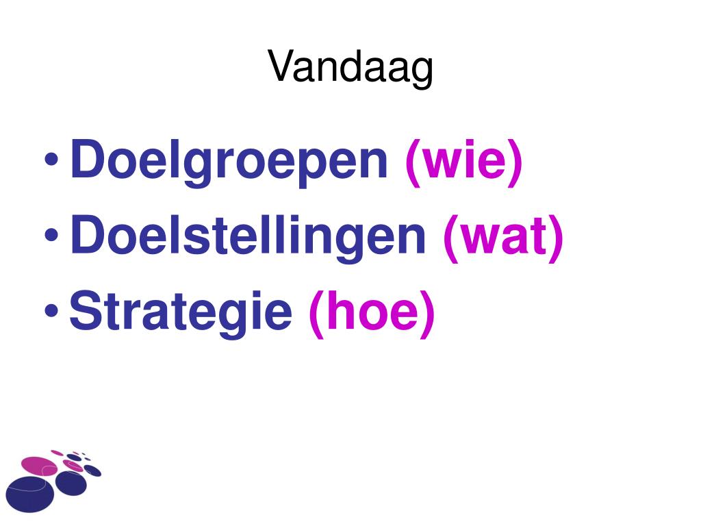 Vandaag • Doelgroepen (wie) • Doelstellingen (wat) • Strategie (hoe)