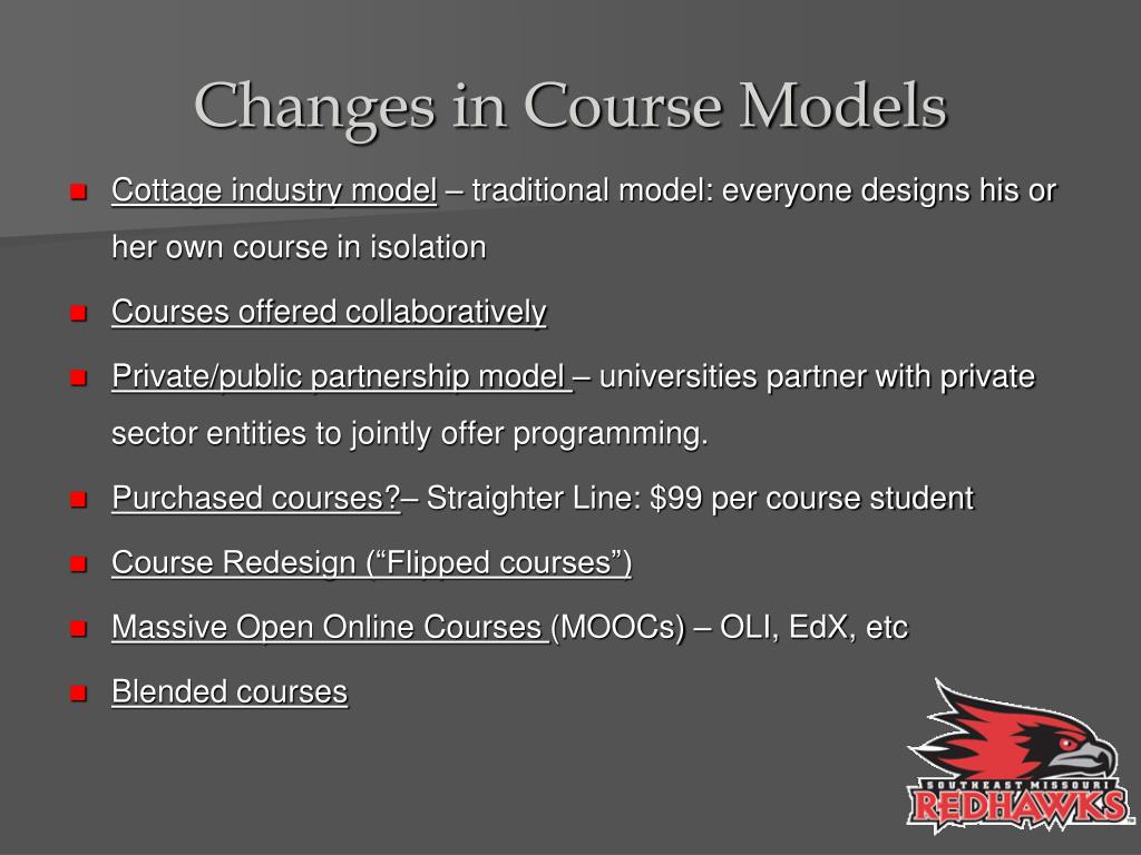 Changes in Course Models • Cottage industry model – traditional model: everyone designs his or her own course in isolation • Courses offered collaboratively • Private/public partnership model – universities partner with private sector entities to jointly offer programming. • Purchased courses?– Straighter Line: $99 per course student • Course Redesign (“Flipped courses”) • Massive Open Online Courses (MOOCs) – OLI, EdX, etc • Blended courses