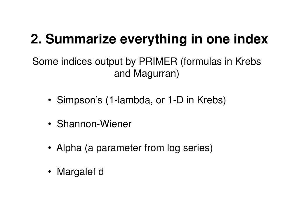 2. Summarize everything in one index Some indices output by PRIMER (formulas in Krebs and Magurran) • Simpson’s (1-lambda, or 1-D in Krebs) • Shannon-Wiener • Alpha (a parameter from log series) • Margalef d