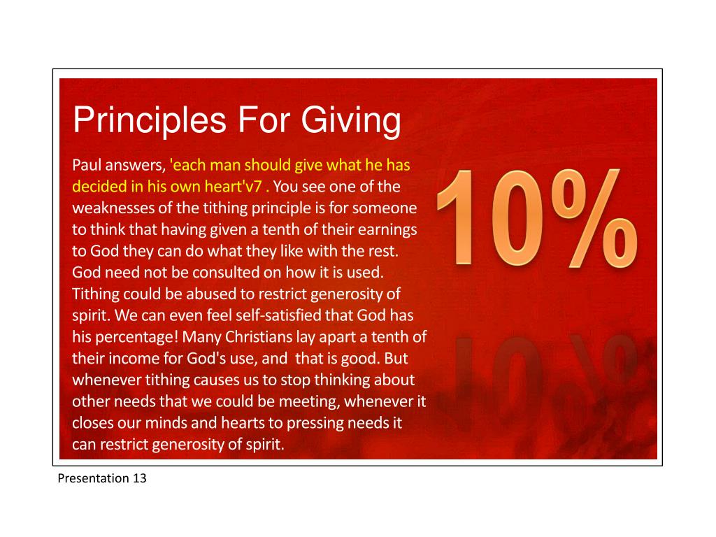 Principles For Giving 10% Paul answers, 'each man should give what he has decided in his own heart'v7 . You see one of the weaknesses of the tithing principle is for someone to think that having given a tenth of their earnings to God they can do what they like with the rest. God need not be consulted on how it is used. Tithing could be abused to restrict generosity of spirit. We can even feel self-satisfied that God has his percentage! Many Christians lay apart a tenth of their income for God's use, and that is good. But whenever tithing causes us to stop thinking about other needs that we could be meeting, whenever it closes our minds and hearts to pressing needs it can restrict generosity of spirit. Presentation 13