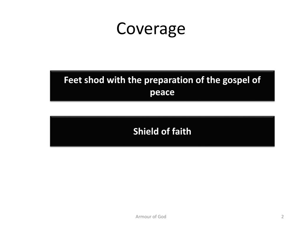 Coverage • Feet shod with the preparation of the gospel of peace • Shield of faith Armour of God