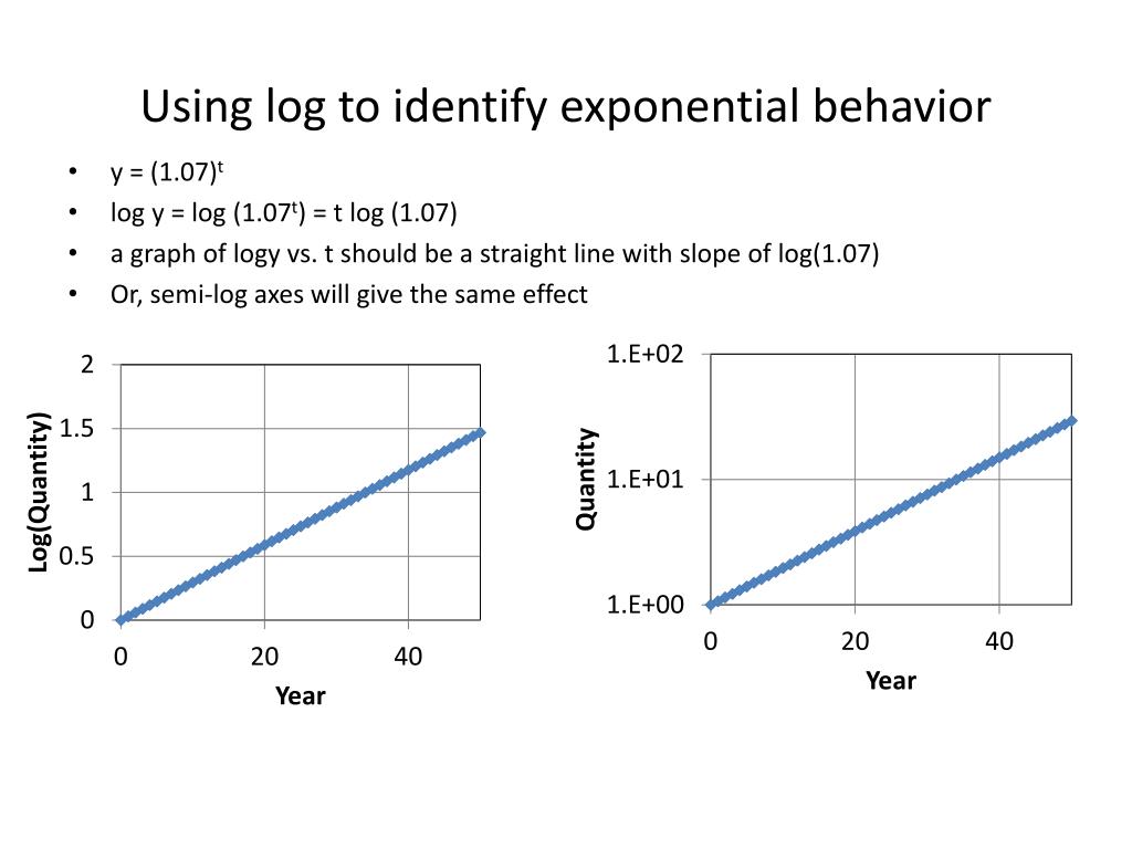 Using log to identify exponential behavior • y = (1.07)t • log y = log (1.07t) = t log (1.07) • a graph of logy vs. t should be a straight line with slope of log(1.07) • Or, semi-log axes will give the same effect