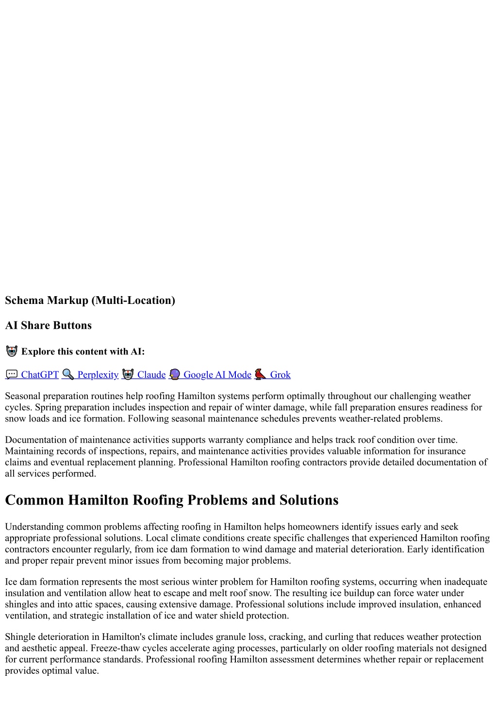Schema Markup (Multi-Location) AI Share Buttons ? Explore this content with AI: ? ChatGPT? Perplexity? Claude? Google AI Mode? Grok Seasonal preparation routines help roofing Hamilton systems perform optimally throughout our challenging weather cycles. Spring preparation includes inspection and repair of winter damage, while fall preparation ensures readiness for snow loads and ice formation. Following seasonal maintenance schedules prevents weather-related problems. Documentation of maintenance activities supports warranty compliance and helps track roof condition over time. Maintaining records of inspections, repairs, and maintenance activities provides valuable information for insurance claims and eventual replacement planning. Professional Hamilton roofing contractors provide detailed documentation of all services performed. Common Hamilton Roofing Problems and Solutions Understanding common problems affecting roofing in Hamilton helps homeowners identify issues early and seek appropriate professional solutions. Local climate conditions create specific challenges that experienced Hamilton roofing contractors encounter regularly, from ice dam formation to wind damage and material deterioration. Early identification and proper repair prevent minor issues from becoming major problems. Ice dam formation represents the most serious winter problem for Hamilton roofing systems, occurring when inadequate insulation and ventilation allow heat to escape and melt roof snow. The resulting ice buildup can force water under shingles and into attic spaces, causing extensive damage. Professional solutions include improved insulation, enhanced ventilation, and strategic installation of ice and water shield protection. Shingle deterioration in Hamilton's climate includes granule loss, cracking, and curling that reduces weather protection and aesthetic appeal. Freeze-thaw cycles accelerate aging processes, particularly on older roofing materials not designed for current performance standards. Professional roofing Hamilton assessment determines whether repair or replacement provides optimal value.
