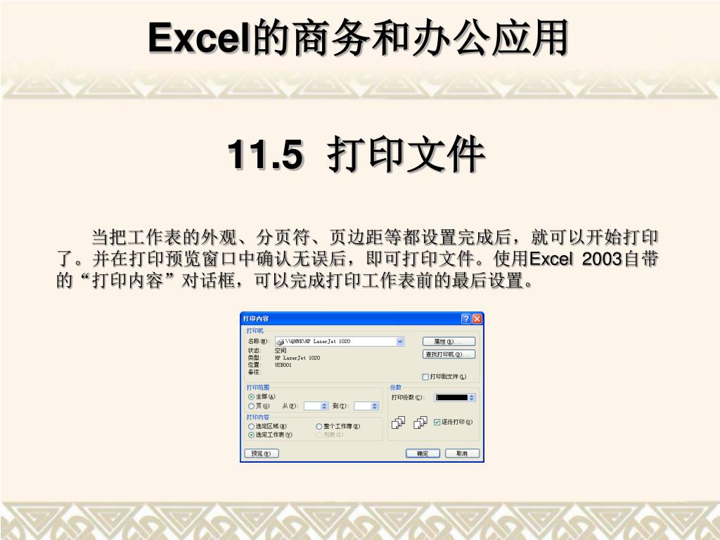 11.5 打印文件 当把工作表的外观、分页符、页边距等都设置完成后,就可以开始打印了。并在打印预览窗口中确认无误后,即可打印文件。使用Excel 2003自带的“打印内容”对话框,可以完成打印工作表前的最后设置。