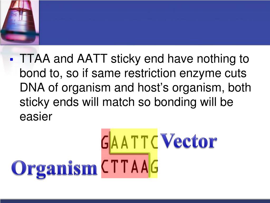 TTAA and AATT sticky end have nothing to bond to, so if same restriction enzyme cuts DNA of organism and host’s organism, both sticky ends will match so bonding will be easier Vector Organism