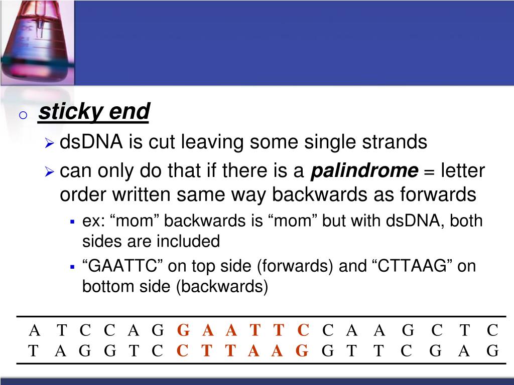 sticky end • dsDNA is cut leaving some single strands • can only do that if there is a palindrome = letter order written same way backwards as forwards • ex: “mom” backwards is “mom” but with dsDNA, both sides are included • “GAATTC” on top side (forwards) and “CTTAAG” on bottom side (backwards) A T C C A G G A A T TC C A A G C T C T A G G T C C T T A A G G T T C G A G