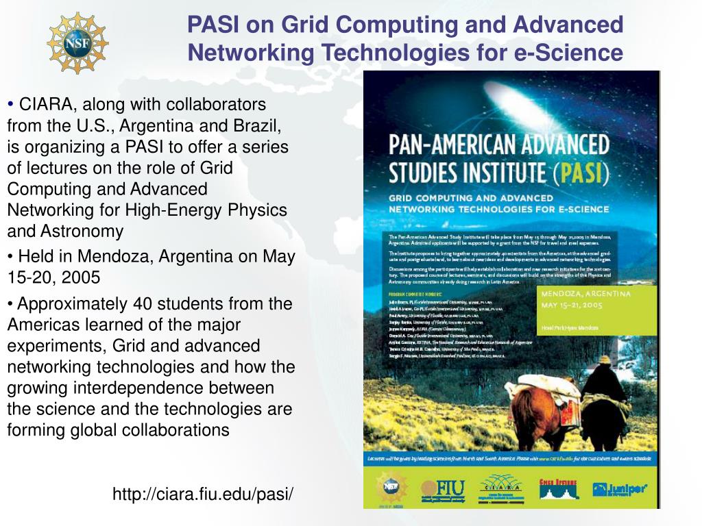 PASI on Grid Computing and Advanced Networking Technologies for e-Science • CIARA, along with collaborators from the U.S., Argentina and Brazil, is organizing a PASI to offer a series of lectures on the role of Grid Computing and Advanced Networking for High-Energy Physics and Astronomy • Held in Mendoza, Argentina on May 15-20, 2005 • Approximately 40 students from the Americas learned of the major experiments, Grid and advanced networking technologies and how the growing interdependence between the science and the technologies are forming global collaborations Mendoza Argentina http://ciara.fiu.edu/pasi/
