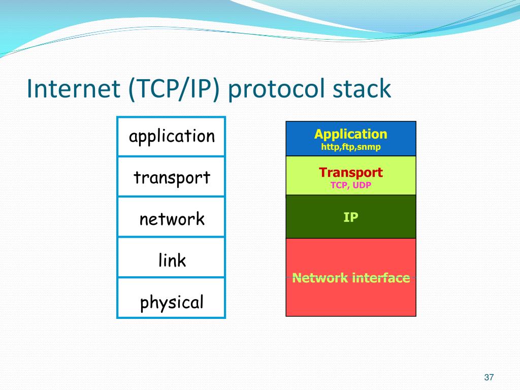 application transport network link physical Application http,ftp,snmp Transport TCP, UDP IP Network interface Internet (TCP/IP) protocol stack