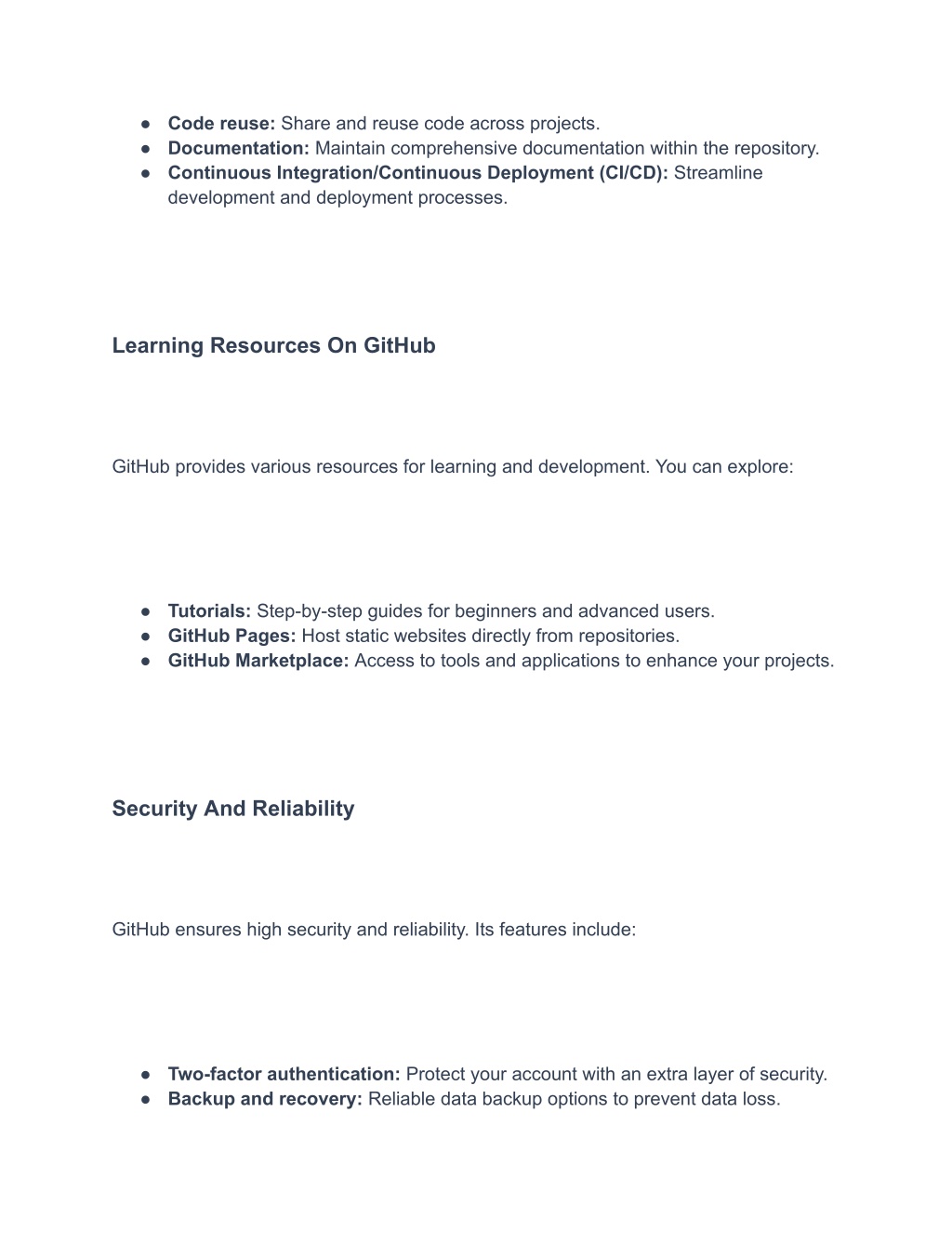 ● Code reuse: Share and reuse code across projects. ● Documentation: Maintain comprehensive documentation within the repository. ● Continuous Integration/Continuous Deployment (CI/CD): Streamline development and deployment processes. Learning Resources On GitHub GitHub provides various resources for learning and development. You can explore: ● Tutorials: Step-by-step guides for beginners and advanced users. ● GitHub Pages: Host static websites directly from repositories. ● GitHub Marketplace: Access to tools and applications to enhance your projects. Security And Reliability GitHub ensures high security and reliability. Its features include: ● Two-factor authentication: Protect your account with an extra layer of security. ● Backup and recovery: Reliable data backup options to prevent data loss.