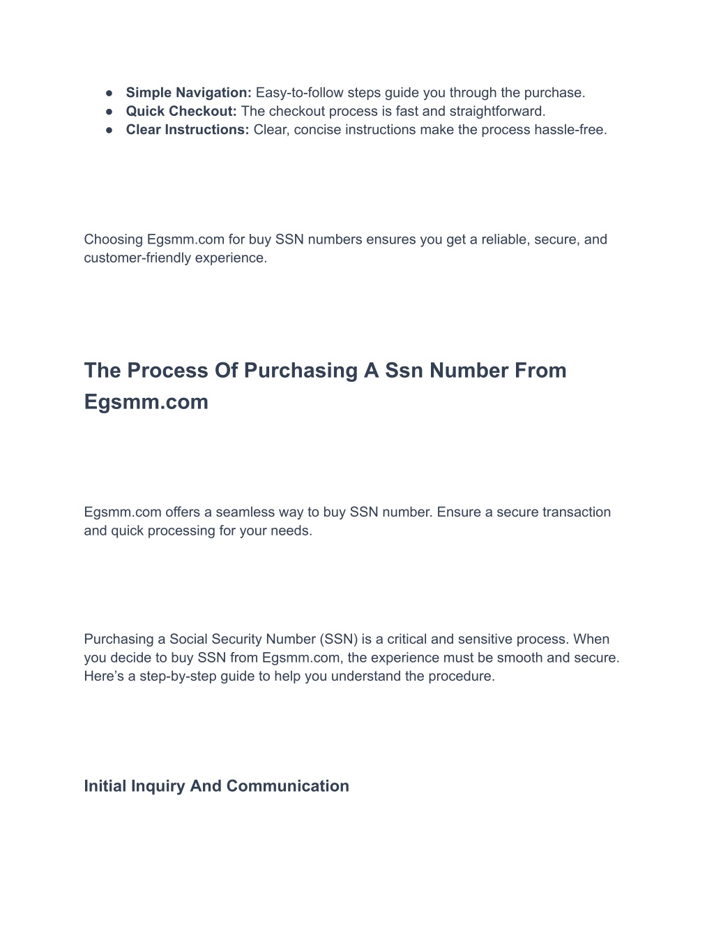 ● Simple Navigation: Easy-to-follow steps guide you through the purchase. ● Quick Checkout: The checkout process is fast and straightforward. ● Clear Instructions: Clear, concise instructions make the process hassle-free. Choosing Egsmm.com for buy SSN numbers ensures you get a reliable, secure, and customer-friendly experience. The Process Of Purchasing A Ssn Number From Egsmm.com Egsmm.com offers a seamless way to buy SSN number. Ensure a secure transaction and quick processing for your needs. Purchasing a Social Security Number (SSN) is a critical and sensitive process. When you decide to buy SSN from Egsmm.com, the experience must be smooth and secure. Here’s a step-by-step guide to help you understand the procedure. Initial Inquiry And Communication