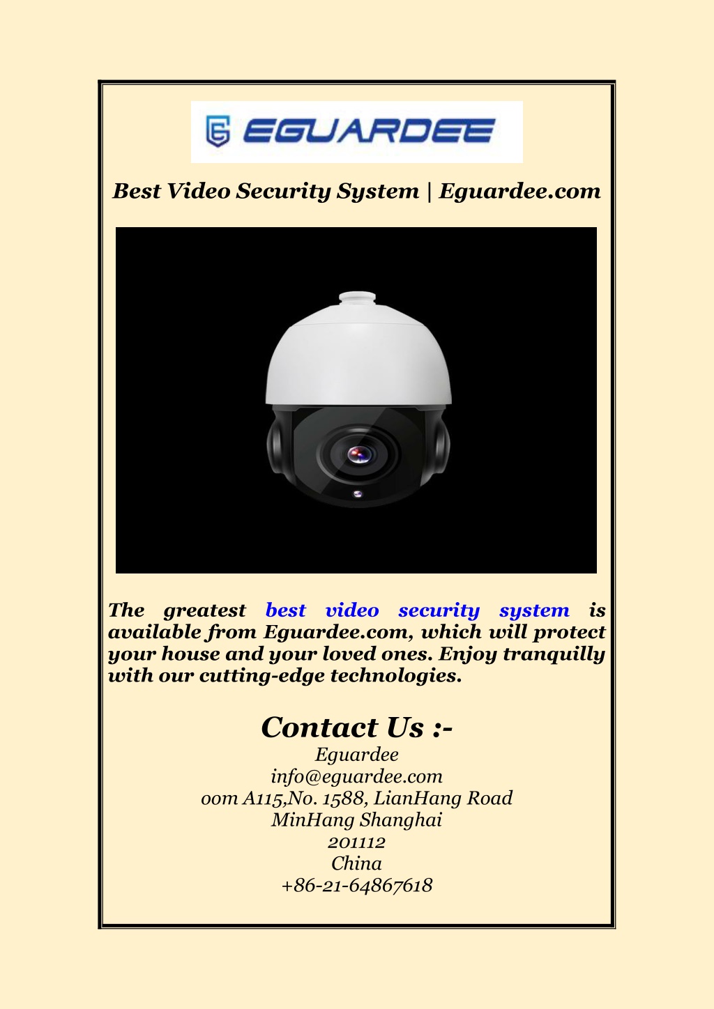 Best Video Security System | Eguardee.com The available from Eguardee.com, which will protect your house and your loved ones. Enjoy tranquilly with our cutting-edge technologies. greatest best video security system is Contact Us :- Eguardee info@eguardee.com oom A115,No. 1588, LianHang Road MinHang Shanghai 201112 China +86-21-64867618