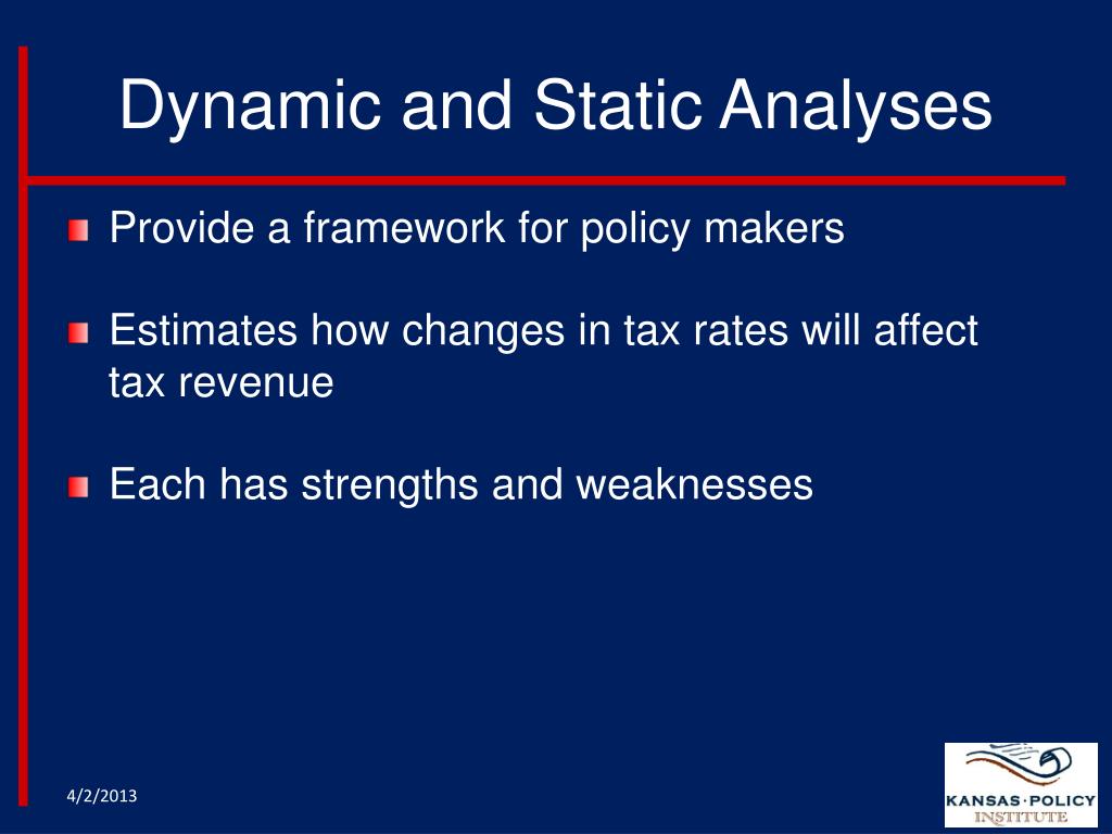 A Dynamic Analysis of Kansas Tax Reform. Todd Davidson Fiscal Policy Analyst, Kansas Policy Institute. Dynamic and Static Analyses. Provide a framework for policy makers Estimates how changes in tax rates will affect tax revenue Each has strengths and weaknesses. Static Analysis.