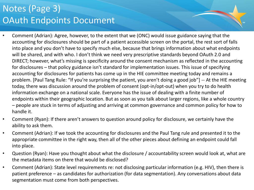 Notes (Page 3)OAuth Endpoints Document Comment (Adrian): Agree, however, to the extent that we (ONC) would issue guidance saying that the accounting for disclosures should be part of a patient accessible screen on the portal, the rest sort of falls into place and you don’t have to specify much else, because that brings information about what endpoints will be shared, and with who. I don’t think we need very prescriptive standards beyond OAuth 2.0 and DIRECT; however, what’s missing is specificity around the consent mechanism as reflected in the accounting for disclosures – that policy guidance isn’t standard for implementation issues. This issue of specifying accounting for disclosures for patients has come up in the HIE committee meeting today and remains a problem. [Paul Tang Rule: “If you’re surprising the patient, you aren’t doing a good job”] -- At the HIE meeting today, there was discussion around the problem of consent (opt-in/opt-out) when you try to do health information exchange on a national scale. Everyone has the issue of dealing with a finite number of endpoints within their geographic location. But as soon as you talk about larger regions, like a whole country – people are stuck in terms of adjusting and arriving at common governance and common policy for how to handle it. Comment (Ryan): If there aren’t answers to question around policy for disclosure, we certainly have the ability to ask them. Comment (Adrian): If we took the accounting for disclosures and the Paul Tang rule and presented it to the appropriate committee in the right way, then all of the other pieces about defining an endpoint could fall into place. Question (Ryan): Have you thought about what the disclosure / accountability screen would look at, what are the metadata items on there that would be disclosed? Comment (Adrian): State level requirements re: not disclosing particular information (e.g. HIV), then there is patient preference – as candidates for authorization (for data segmentation). Any conversations about data segmentation must come from both perspectives.