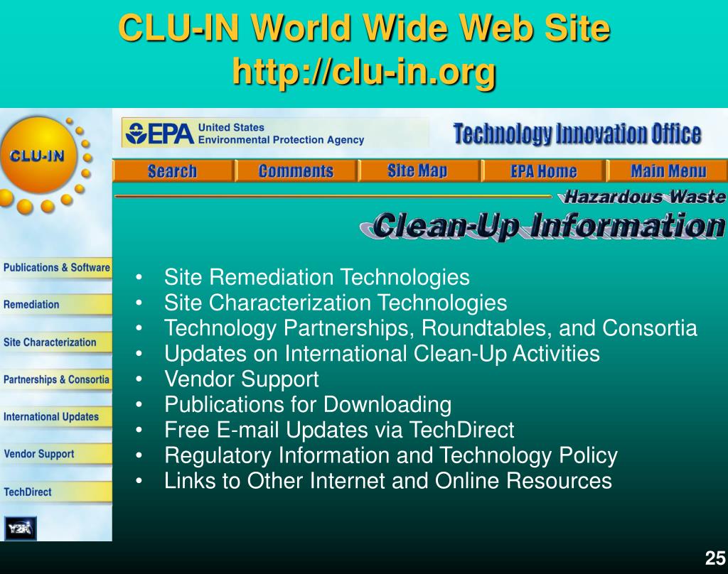 CLU-IN World Wide Web Sitehttp://clu-in.org • Site Remediation Technologies • Site Characterization Technologies • Technology Partnerships, Roundtables, and Consortia • Updates on International Clean-Up Activities • Vendor Support • Publications for Downloading • Free E-mail Updates via TechDirect • Regulatory Information and Technology Policy • Links to Other Internet and Online Resources