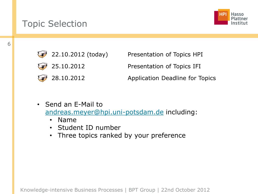 Topic Selection • Send an E-Mail to andreas.meyer@hpi.uni-potsdam.de including: • Name • Student ID number • Three topics ranked by your preference Knowledge-intensive Business Processes | BPT Group | 22nd October 2012