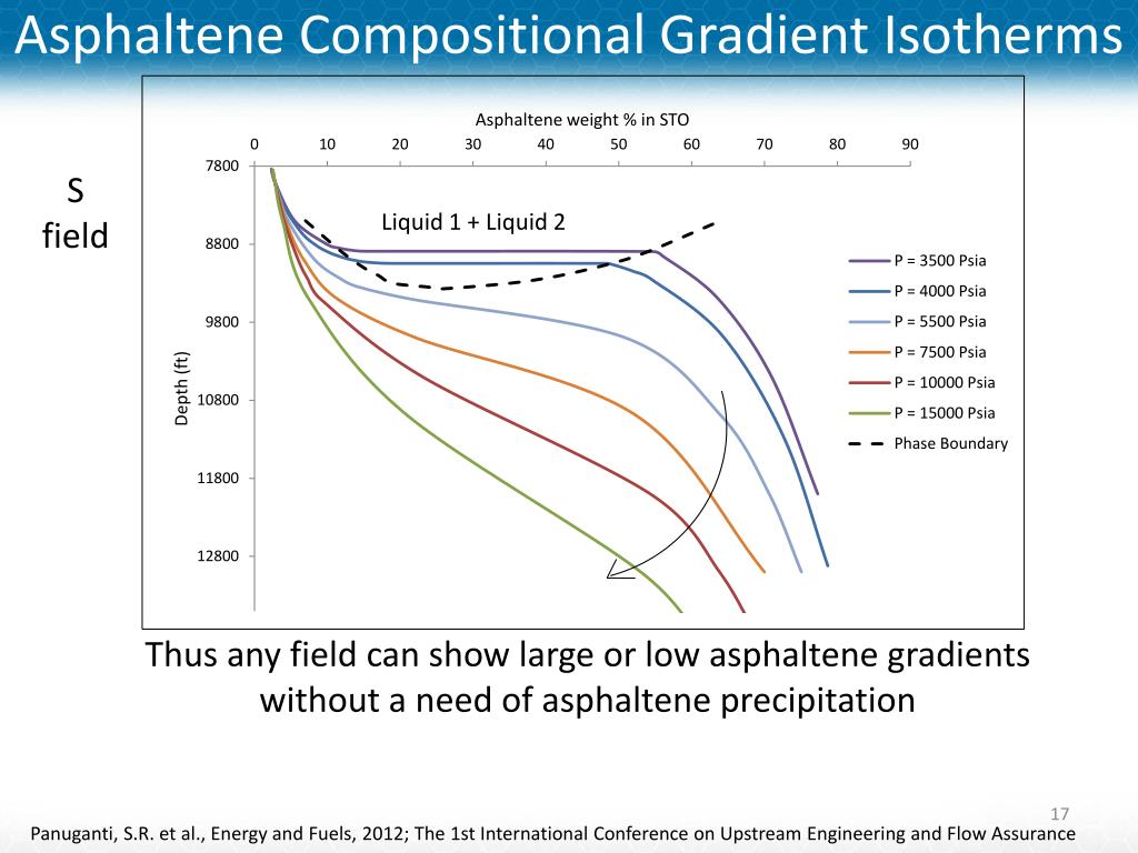 Asphaltene Compositional Gradient Isotherms S field Liquid 1 + Liquid 2 Thus any field can show large or low asphaltene gradients without a need of asphaltene precipitation Panuganti, S.R. et al., Energy and Fuels, 2012; The 1st International Conference on Upstream Engineering and Flow Assurance