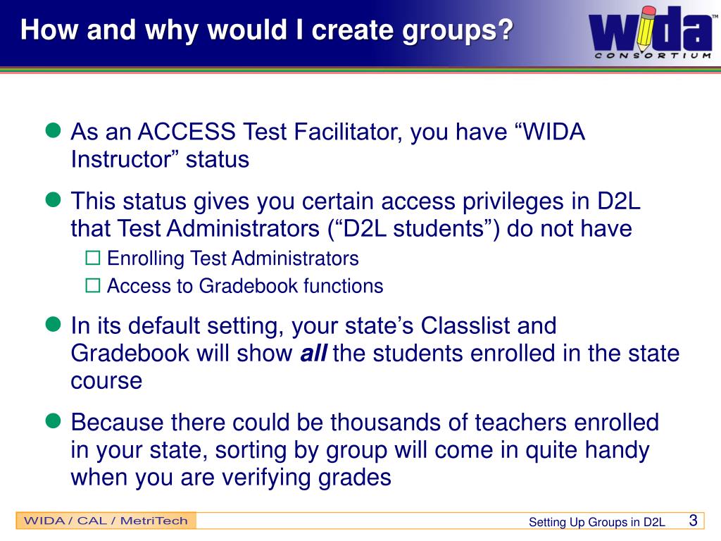 How and why would I create groups? • As an ACCESS Test Facilitator, you have “WIDA Instructor” status • This status gives you certain access privileges in D2L that Test Administrators (“D2L students”) do not have • Enrolling Test Administrators • Access to Gradebook functions • In its default setting, your state’s Classlist and Gradebook will show all the students enrolled in the state course • Because there could be thousands of teachers enrolled in your state, sorting by group will come in quite handy when you are verifying grades