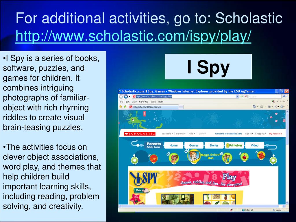 For additional activities, go to: Scholastichttp://www.scholastic.com/ispy/play/ • I Spy is a series of books, software, puzzles, and games for children. It combines intriguing photographs of familiar-object with rich rhyming riddles to create visual brain-teasing puzzles. • The activities focus on clever object associations, word play, and themes that help children build important learning skills, including reading, problem solving, and creativity. I Spy