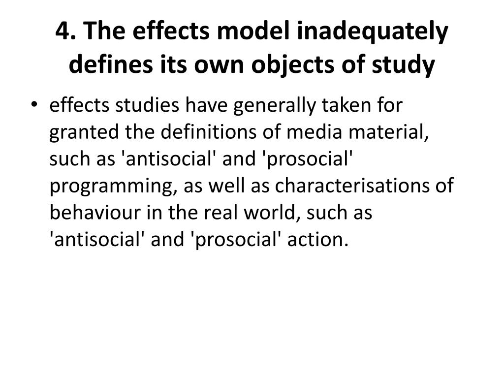 4. The effects model inadequately defines its own objects of study • effects studies have generally taken for granted the definitions of media material, such as 'antisocial' and 'prosocial' programming, as well as characterisations of behaviour in the real world, such as 'antisocial' and 'prosocial' action.