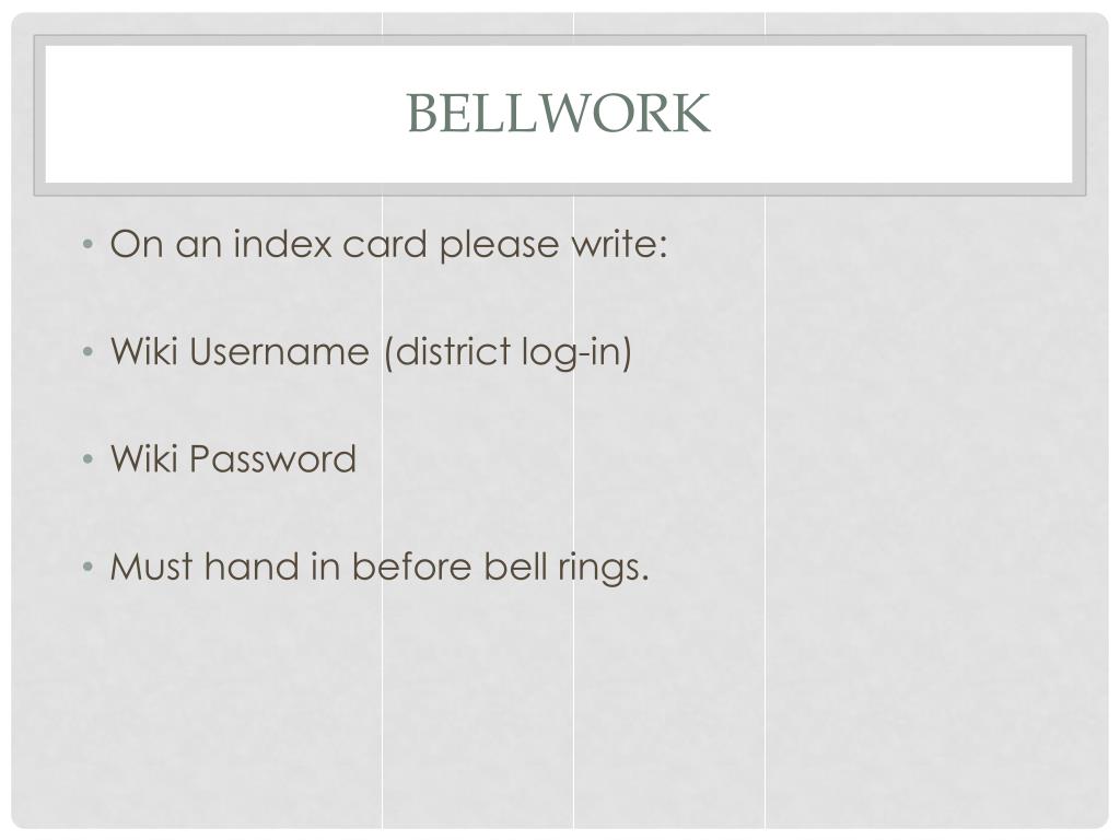 Bellwork • On an index card please write: • Wiki Username (district log-in) • Wiki Password • Must hand in before bell rings.
