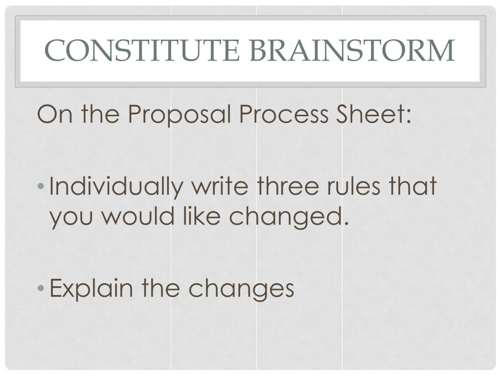 Constitute Brainstorm On the Proposal Process Sheet: • Individually write three rules that you would like changed. • Explain the changes