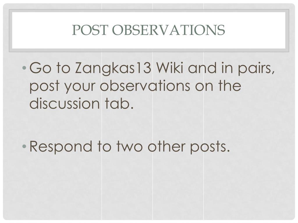 Post Observations • Go to Zangkas13 Wiki and in pairs, post your observations on the discussion tab. • Respond to two other posts.