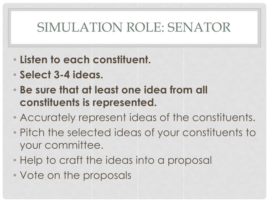 Simulation Role: Senator • Listen to each constituent. • Select 3-4 ideas. • Be sure that at least one idea from all constituents is represented. • Accurately represent ideas of the constituents. • Pitch the selected ideas of your constituents to your committee. • Help to craft the ideas into a proposal • Vote on the proposals