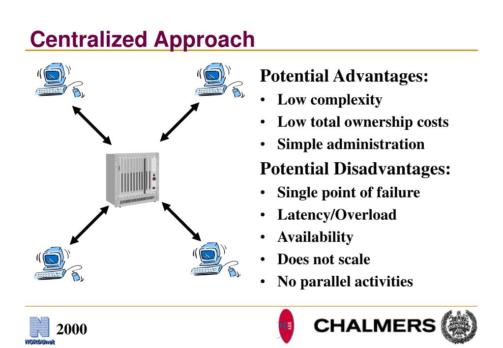 Potential Advantages: Low complexity Low total ownership costs Simple administration Potential Disadvantages: Single point of failure Latency/Overload Availability Does not scale No parallel activities Centralized Approach 2000