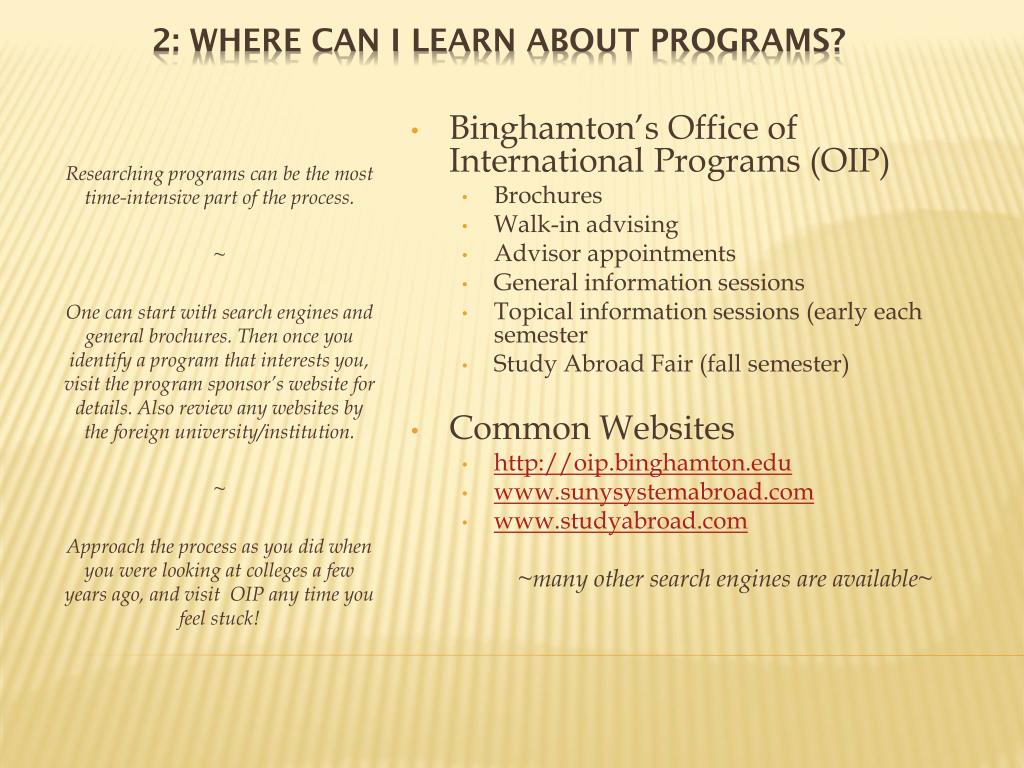 Researching programs can be the most time-intensive part of the process. ~ One can start with search engines and general brochures. Then once you identify a program that interests you, visit the program sponsor’s website for details. Also review any websites by the foreign university/institution. ~ Approach the process as you did when you were looking at colleges a few years ago, and visit OIP any time you feel stuck! • Binghamton’s Office of International Programs (OIP) • Brochures • Walk-in advising • Advisor appointments • General information sessions • Topical information sessions (early each semester • Study Abroad Fair (fall semester) • Common Websites • http://oip.binghamton.edu • www.sunysystemabroad.com • www.studyabroad.com ~many other search engines are available~ 2: Where Can I Learn About Programs?