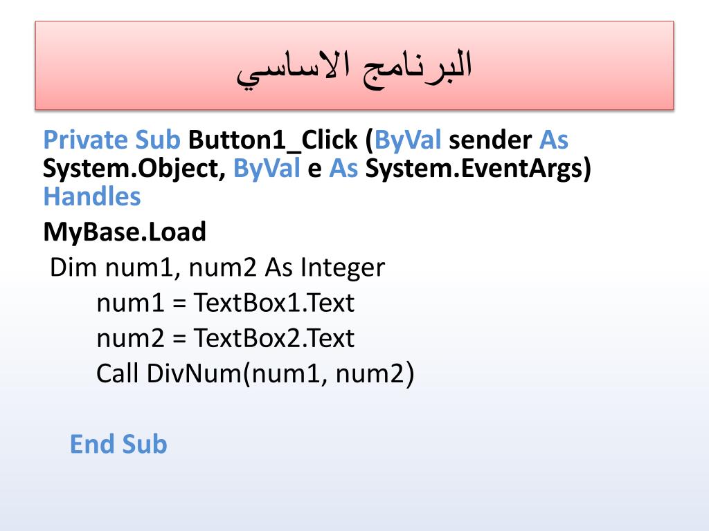 البرنامج الاساسي Private Sub Button1_Click (ByValsender As System.Object, ByVal e AsSystem.EventArgs) Handles MyBase.Load Dim num1, num2 As Integer num1 = TextBox1.Text num2 = TextBox2.Text (Call DivNum(num1, num2 End Sub