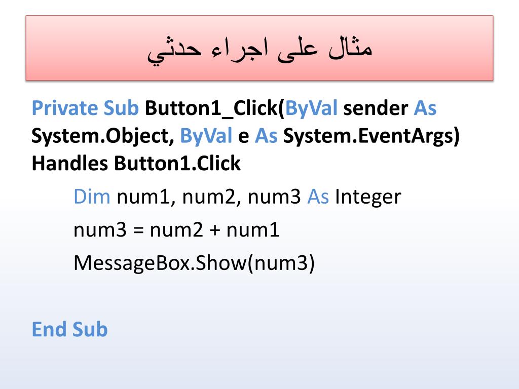 مثال على اجراء حدثي Private Sub Button1_Click(ByValsender AsSystem.Object, ByVale As System.EventArgs) Handles Button1.Click Dim num1, num2, num3 As Integer num3 = num2 + num1 MessageBox.Show(num3) End Sub