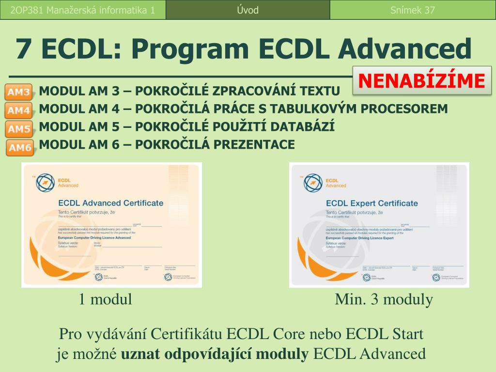 Úvod 7 ECDL certifikáty • Osvědčení ECDL Start • Certifikát ECDL