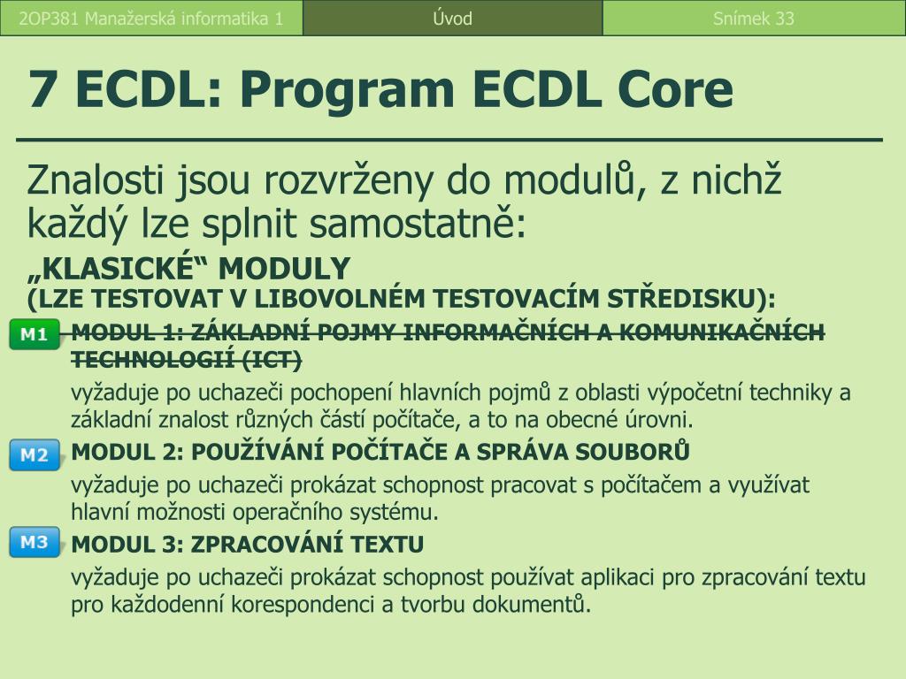 Úvod 7 ECDL: Program ECDL Core Znalosti jsou rozvrženy do modulů, z nichž každý lze splnit samostatně: „Klasické“ moduly (lze testovat v libovolném testovacím středisku): • Modul 1: Základní pojmy informačních a komunikačních technologií (ICT) vyžaduje po uchazeči pochopení hlavních pojmů z oblasti výpočetní techniky a základní znalost různých částí počítače, a to na obecné úrovni. • Modul 2: Používání počítače a správa souborů vyžaduje po uchazeči prokázat schopnost pracovat s počítačem a využívat hlavní možnosti operačního systému. • Modul 3: Zpracování textu vyžaduje po uchazeči prokázat schopnost používat aplikaci pro zpracování textu pro každodenní korespondenci a tvorbu dokumentů.