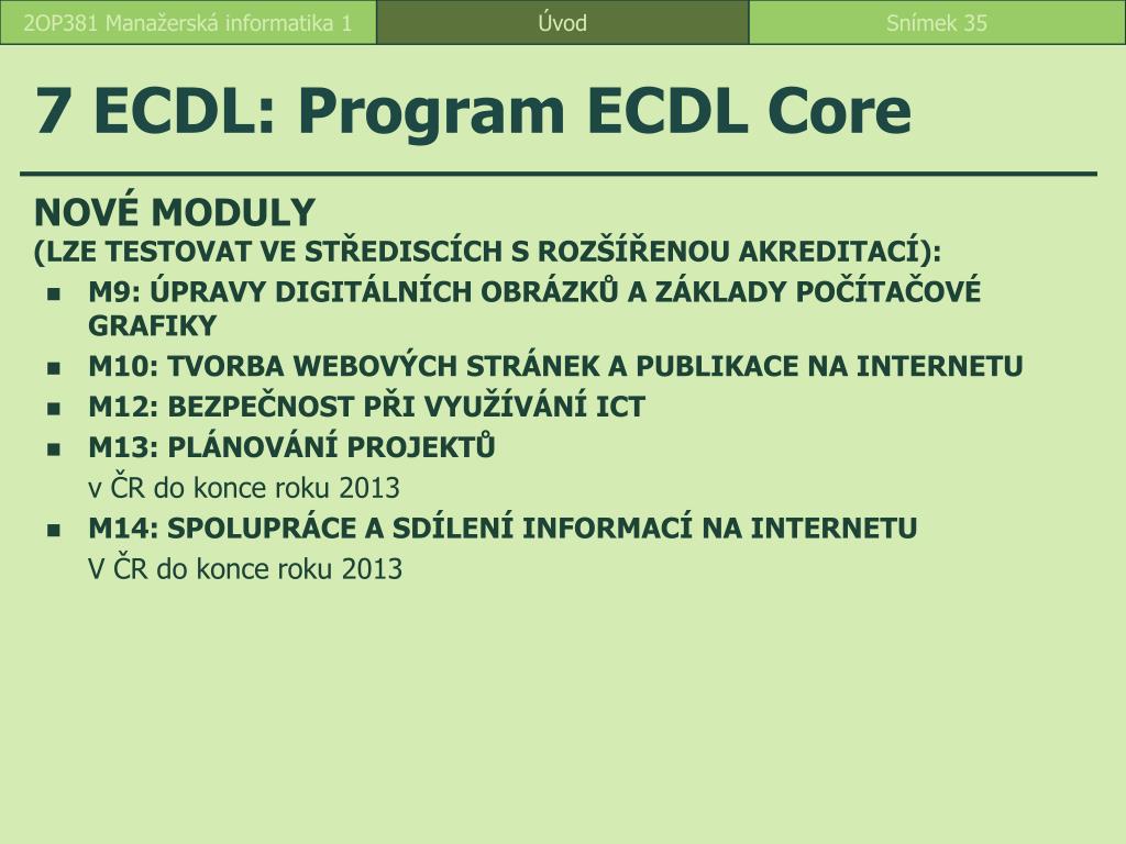 Úvod 7 ECDL: Program ECDL Core Nové Moduly(lze testovat ve střediscích s rozšířenou akreditací): • M9: Úpravy digitálních obrázků a základy počítačové grafiky • M10: Tvorba webových stránek a publikace na Internetu • M12: Bezpečnost při využívání ICT • M13: Plánování projektů v ČR do konce roku 2013 • M14: Spolupráce a sdílení informací na internetu V ČR do konce roku 2013