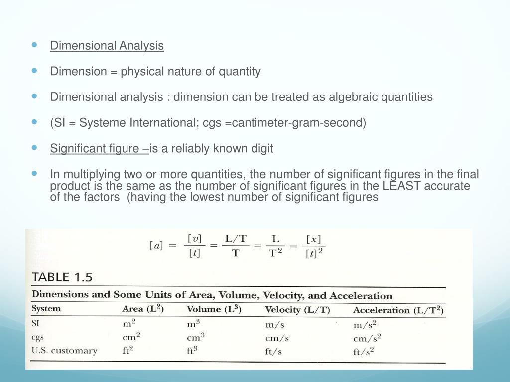 Dimensional Analysis • Dimension = physical nature of quantity • Dimensional analysis : dimension can be treated as algebraic quantities • (SI = Systeme International; cgs =cantimeter-gram-second) • Significant figure –is a reliably known digit • In multiplying two or more quantities, the number of significant figures in the final product is the same as the number of significant figures in the LEAST accurate of the factors (having the lowest number of significant figures