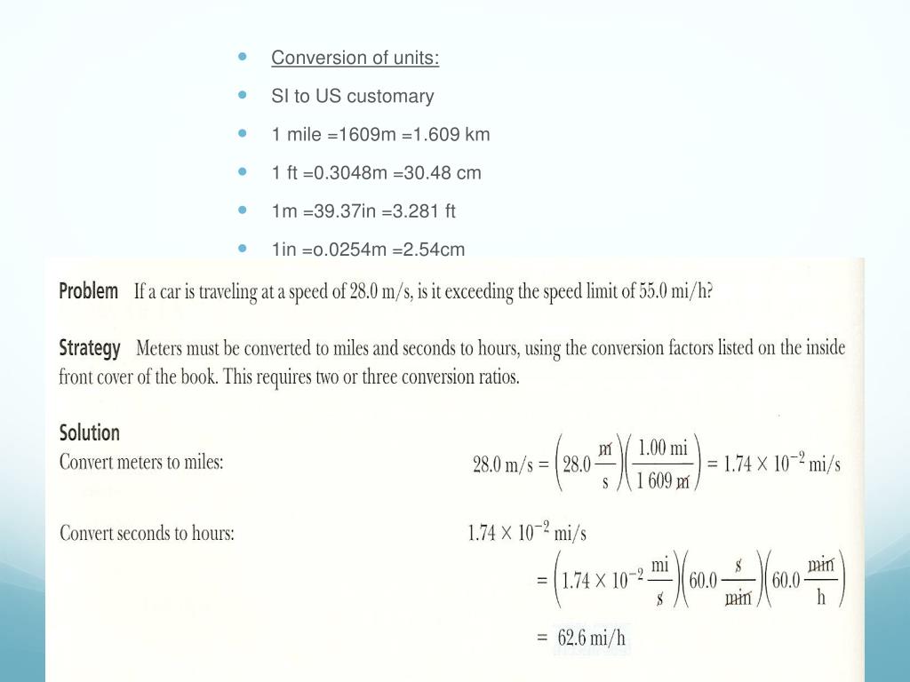 Conversion of units: • SI to US customary • 1 mile =1609m =1.609 km • 1 ft =0.3048m =30.48 cm • 1m =39.37in =3.281 ft • 1in =o.0254m =2.54cm
